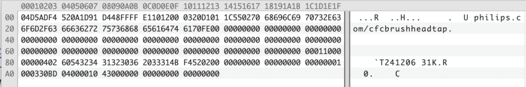 This is what a dump of the Mifare Ultralight NTAG213‘s memory from a white Sonicare A3 Premium All-in-One head looks like: